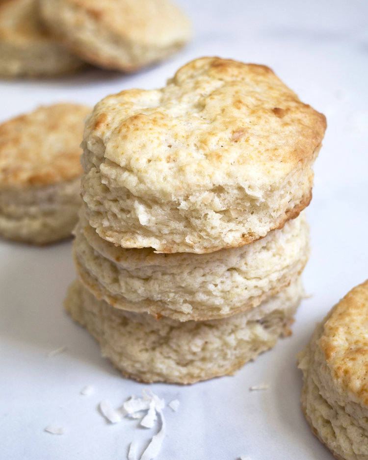 I know I’m not the only person who always has a lingering half-full bottle of buttermilk in their fridge after they’ve made biscuits, cornbread, or even a cake. I always plan to make something to use up the extra buttermilk, but before I know it, it’s expired and has to be thrown out. Enter in: coconut cream! It comes in a can with a long shelf life, and the can will mostly be used up with one batch of these biscuits.